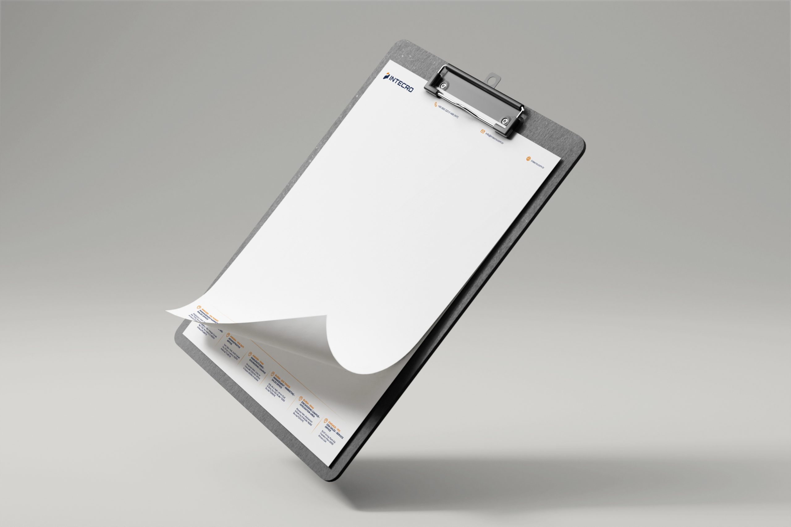Antetli kâğıtlarda kullanılacak Intecro sembolü ve logolar, yalnızca kurumsal kimlik kılavuzunda belirtilen renklerde yer alabilir. Bu renkler; Intecro laciverti başta olmak üzere, Intecro turuncusu, siyah, beyaz ve gri olarak tanımlanmıştır.