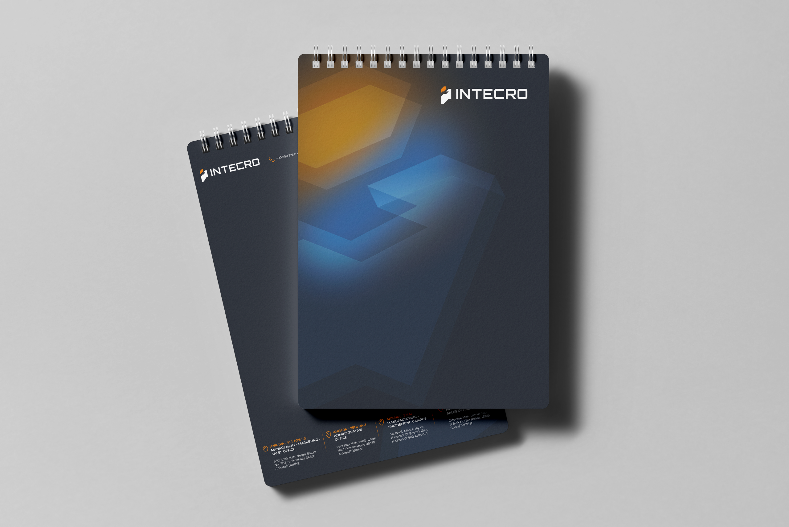 Bloknotlarda yer alacak Intecro sembolü ve logolar, yalnızca kurumsal kimlik kılavuzunda belirtilen renklerde kullanılabilir. Bu renkler; Intecro laciverti başta olmak üzere, Intecro turuncusu, siyah, beyaz ve gri tonlarını içermektedir.