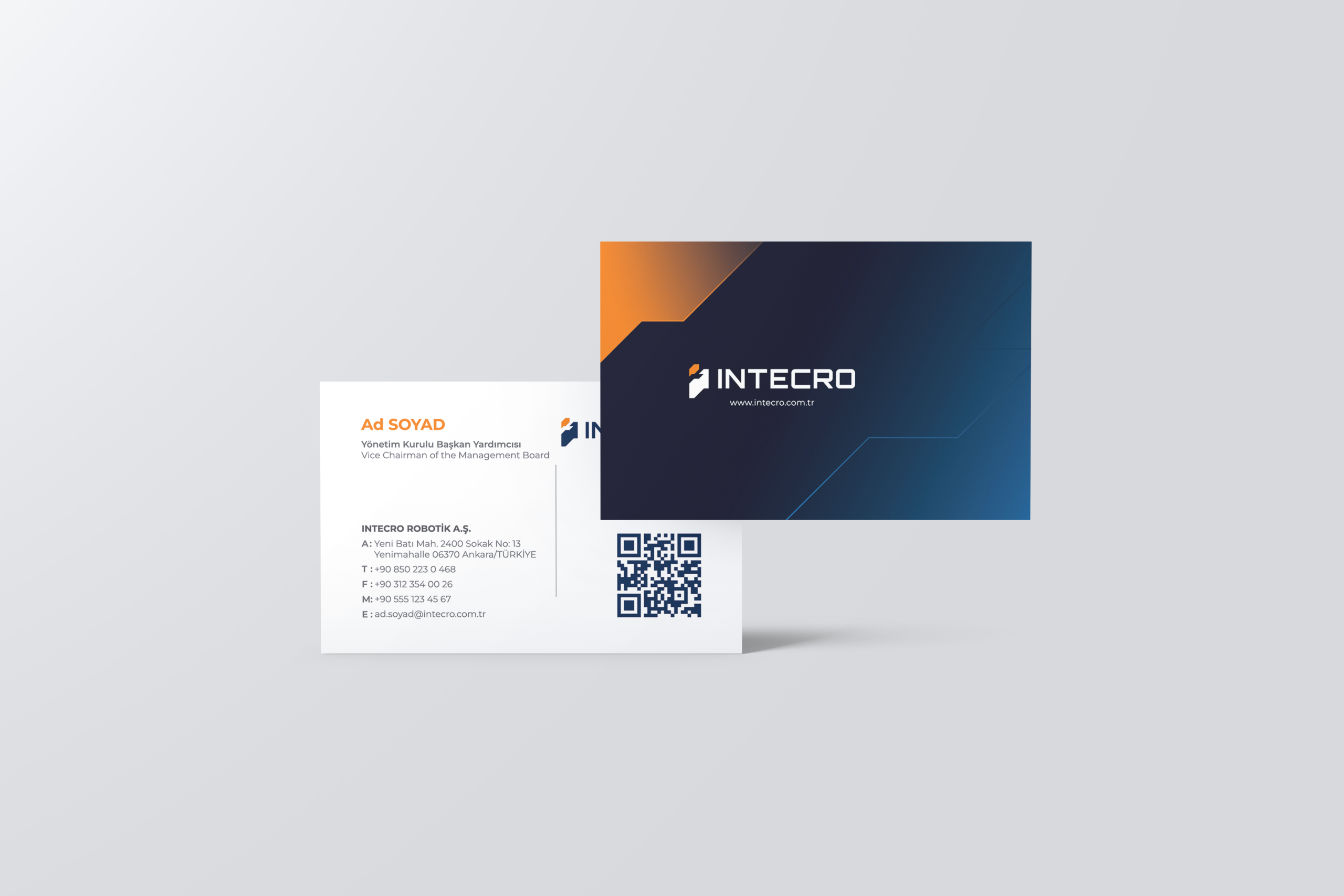 Kartvizit tasarımı, Intecro’nun kurumsal kimliğini yansıtan sade, profesyonel ve teknolojik bir anlayışla hazırlanmalıdır.