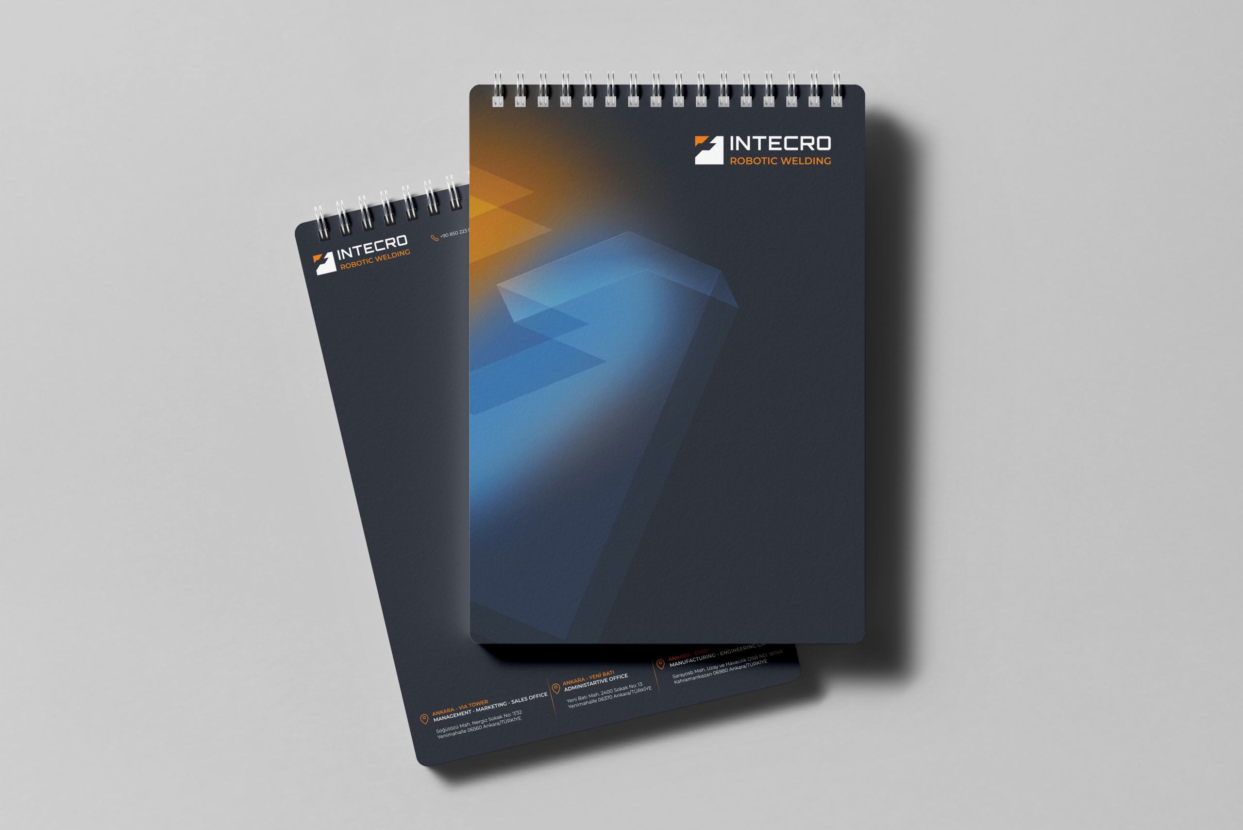 Bloknotlarda yer alacak Intecro Robotic Welding sembolü ve logolar, yalnızca kurumsal kimlik kılavuzunda belirtilen renklerde kullanılabilir. Bu renkler; Intecro Robotic Welding laciverti başta olmak üzere, Intecro Robotic Welding turuncusu, siyah, beyaz ve gri tonlarını içermektedir.